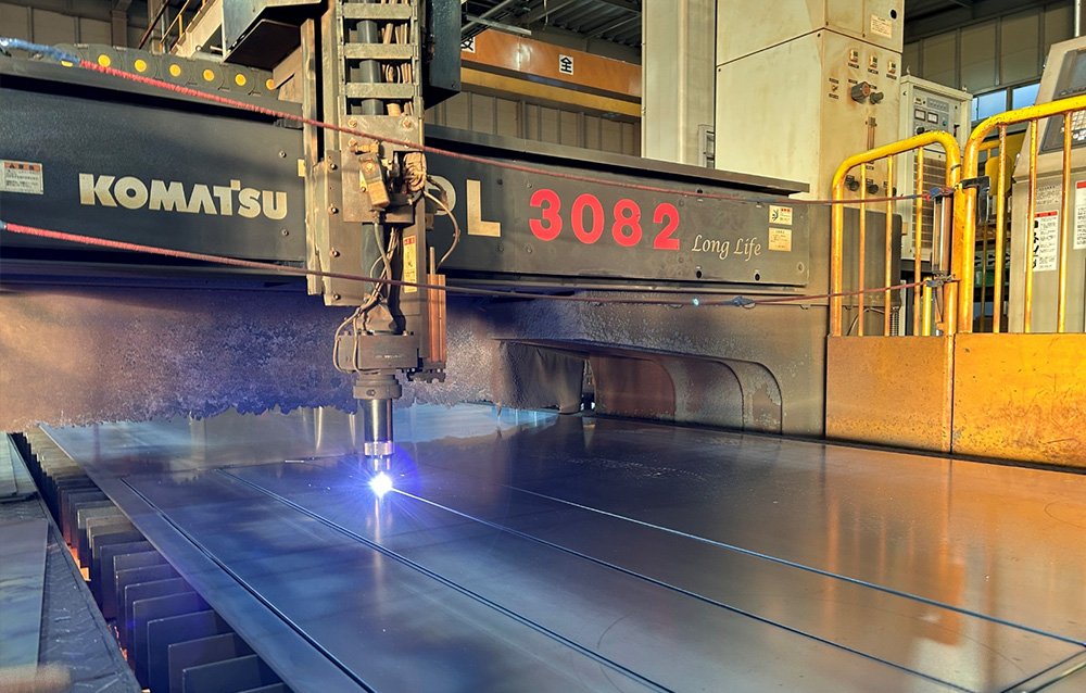 プラズマ加工 プラズマ加工は、10,000℃以上の熱で金属を溶かして切断する加工になります。ガス溶断に比べ切断速度が速く、板厚16mm~25mmまでを切断しています。