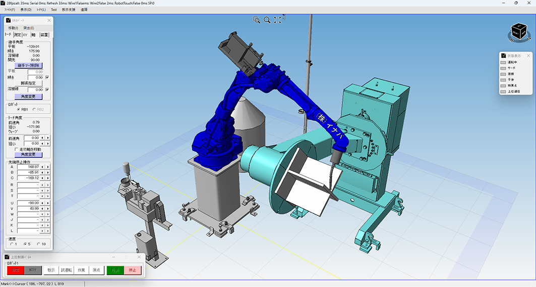 溶接ロボットには、生産性の向上や品質安定、作業環境の改善など、多くのメリットが有ります。ロボットを動作させるためにはプログラムをする必要があり、その作業をティーチングと言います。社内にティーチングマンが在籍し、ロボットを実際に動かして動作を記憶させる「オンラインティーチング」と、専用ソフトを使ってパソコンで生成したデータをロボットに転送する「オフラインティーチング」、両方を行っております。
