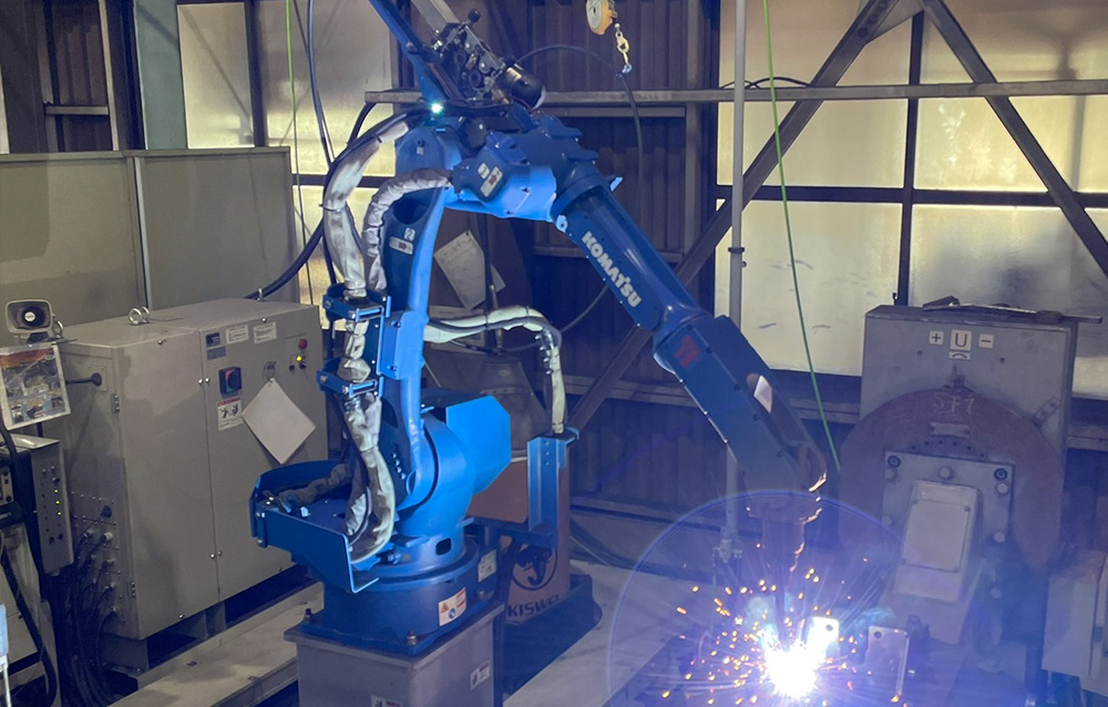 溶接ロボット 溶接ロボットを10台所有しています。ワイヤタッチセンサで制御され、溶接歪みや材料寸法の個体差による現物とプログラムの位置ズレを補正し、常に正確な位置に溶接を行うことが可能です。